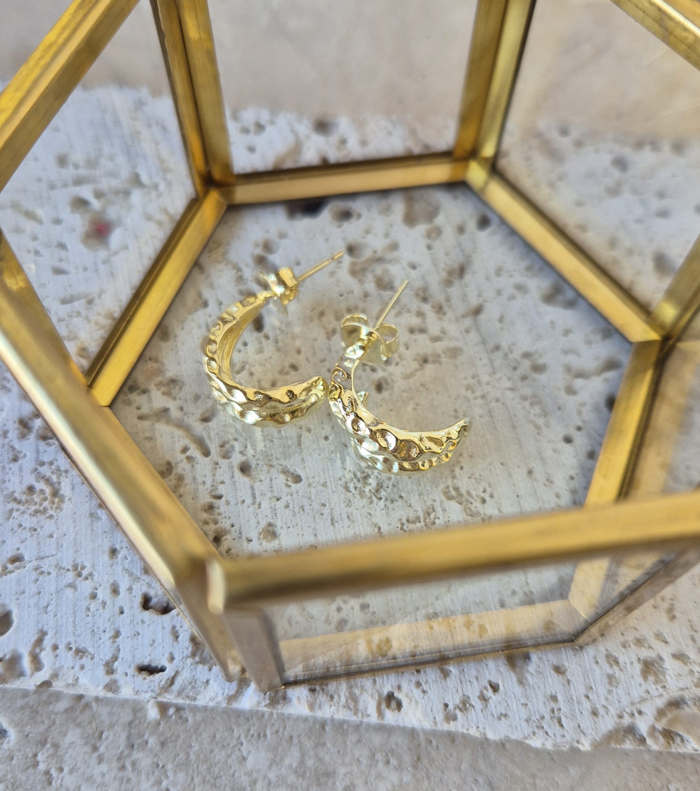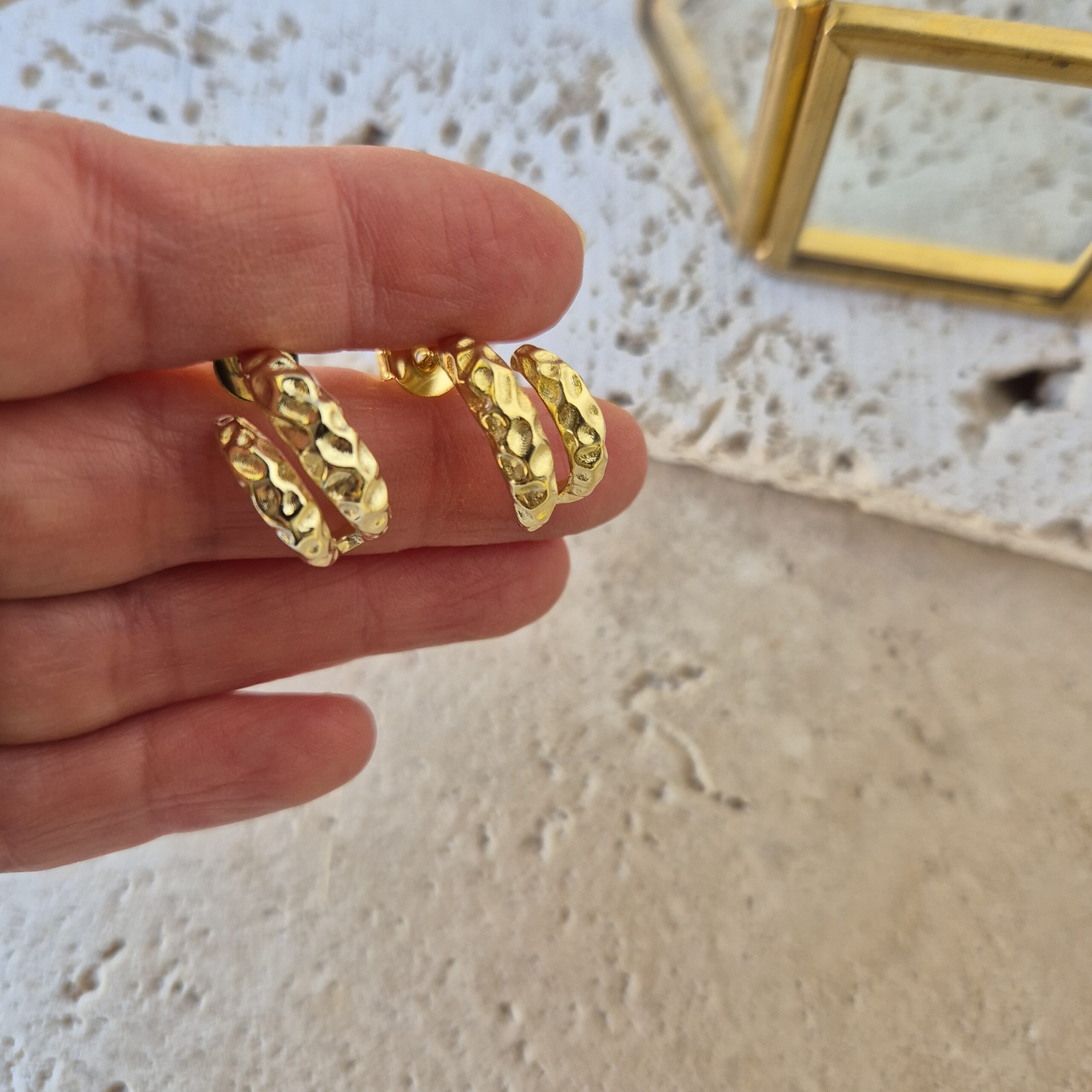 Exclusivas argollas dobles martilladas, el material es enchape de oro 18k brasileño, libres de níquel e hipoalergénicas, miden alrededor de 18 mm, si tu estilo es minimilista, estos aros son tu mejor opción.