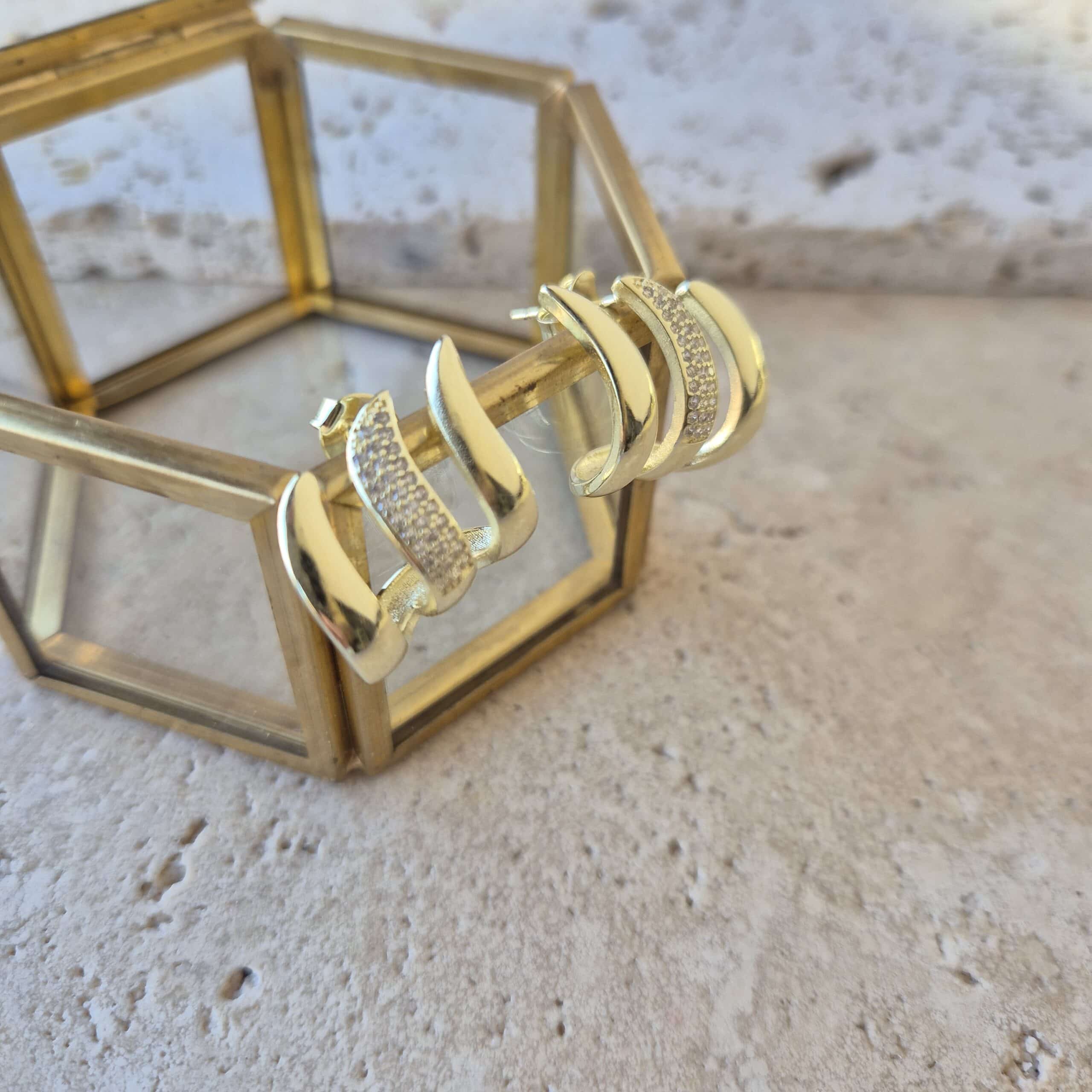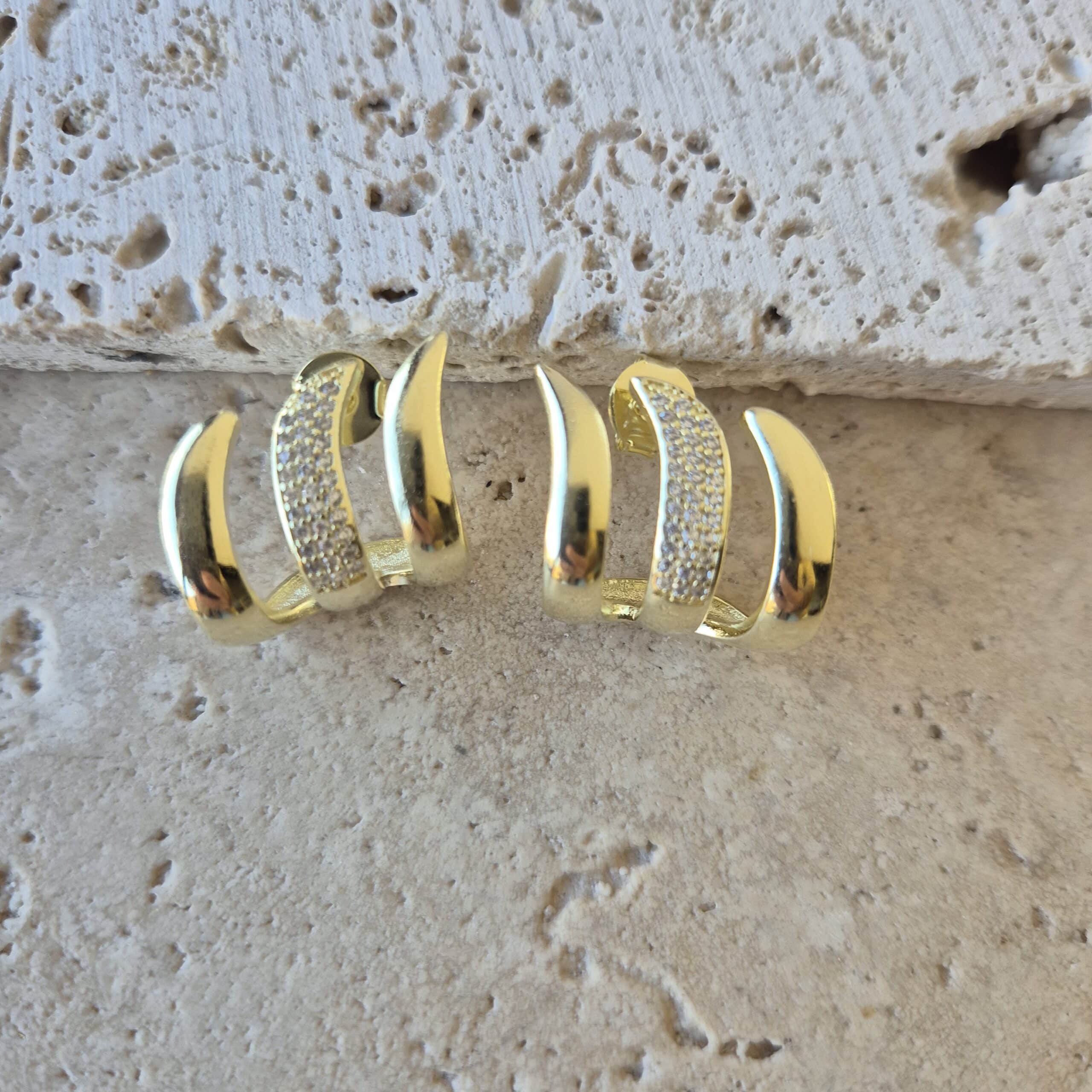 Argollas trepadoras triple, macizas con inscrustaciones de circones, el material es bronce con enchape de oro 18k brasileño, miden alrededor de 3 cms. Libres de níquel