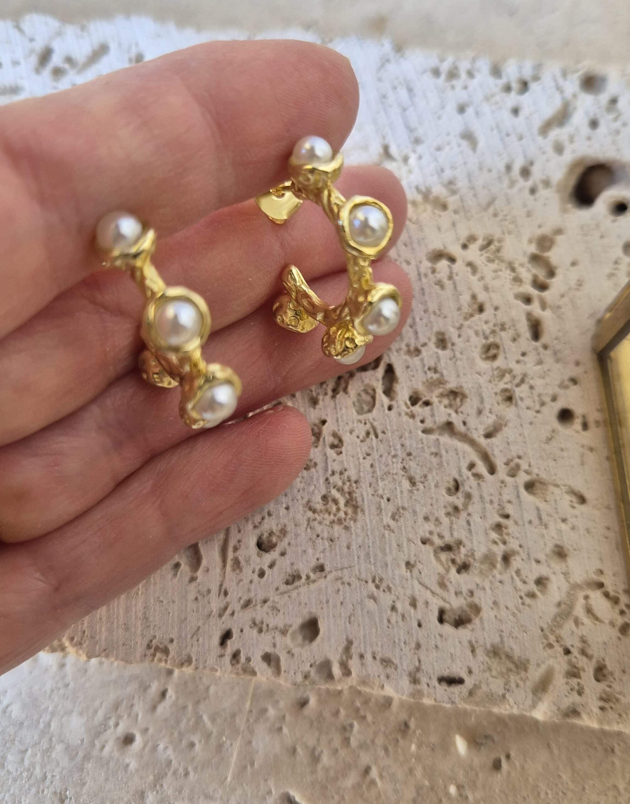 Maravillosas argollas martilladas con incrustaciones de perlas de río, base bronce con enchape de oro amarillo 18k, libres de níquel, hipoalergénico. Miden 25 mm aprox