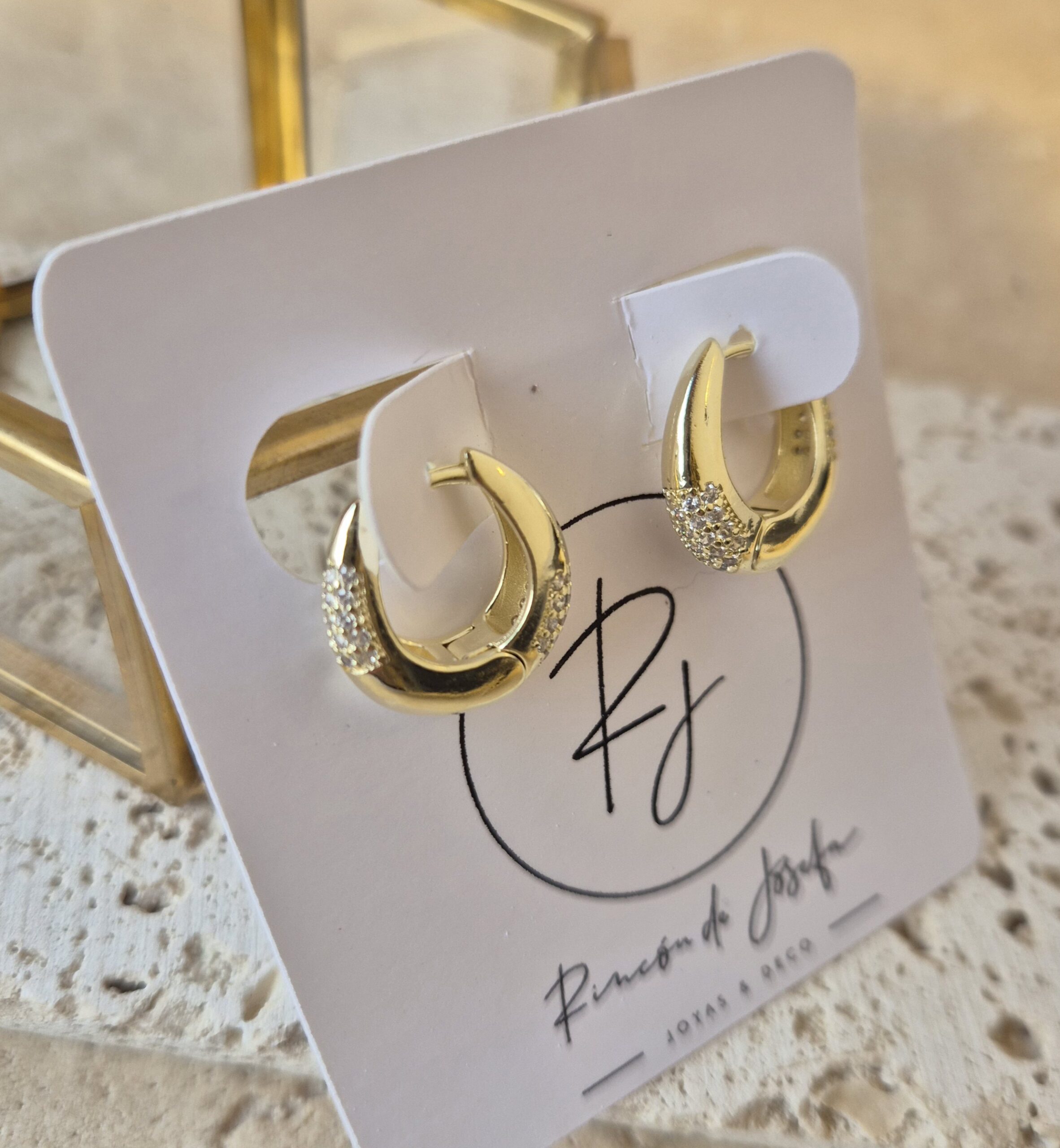 Argollas Paris, para combinarlas con todo, son macizas, pero livianas, con inscrustaciones de circones que las hacen aún mas estilosas. El material es bronce con enchape de oro 18k, libres de níquel.. Miden alrededor de 2 cms.