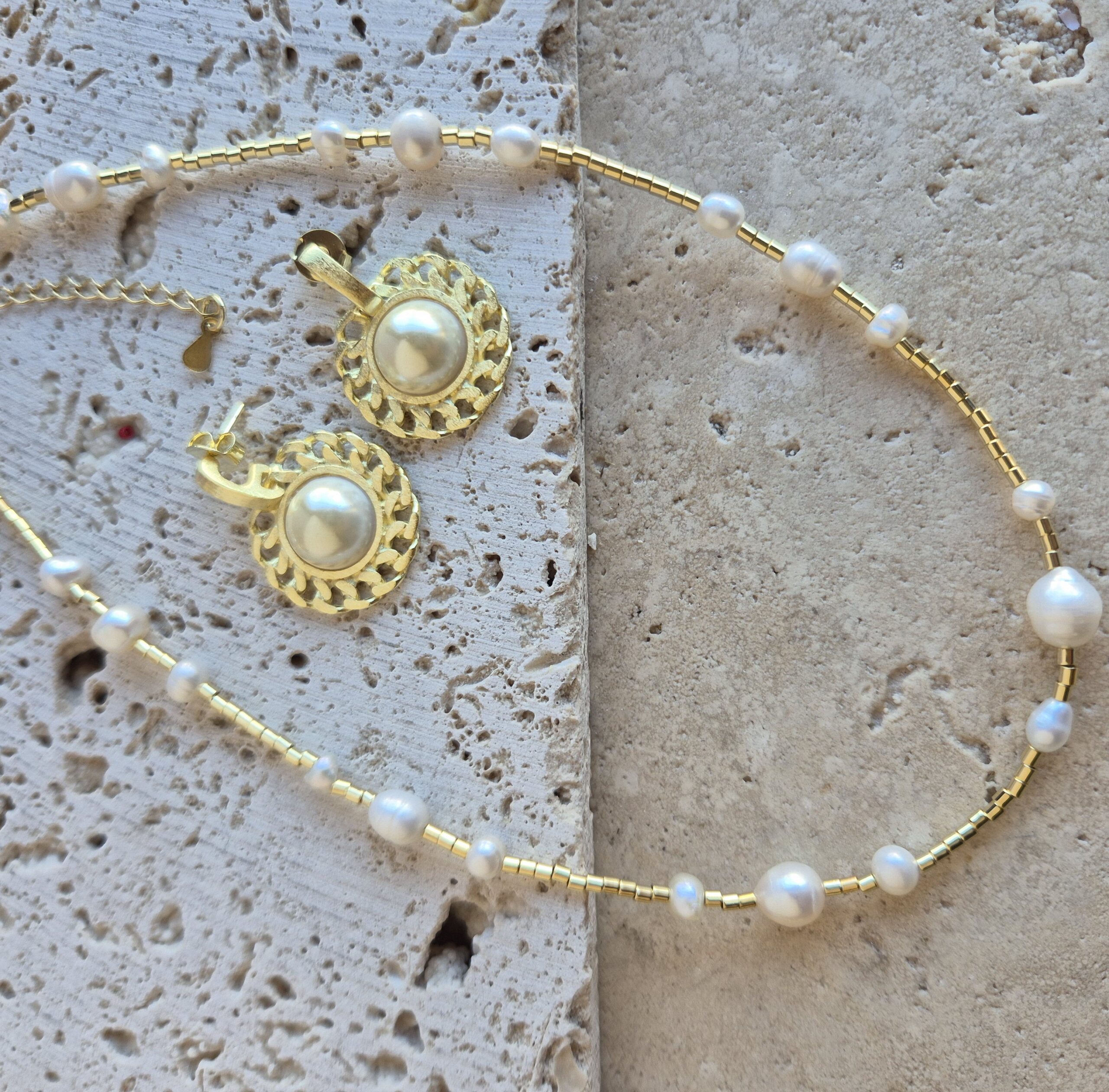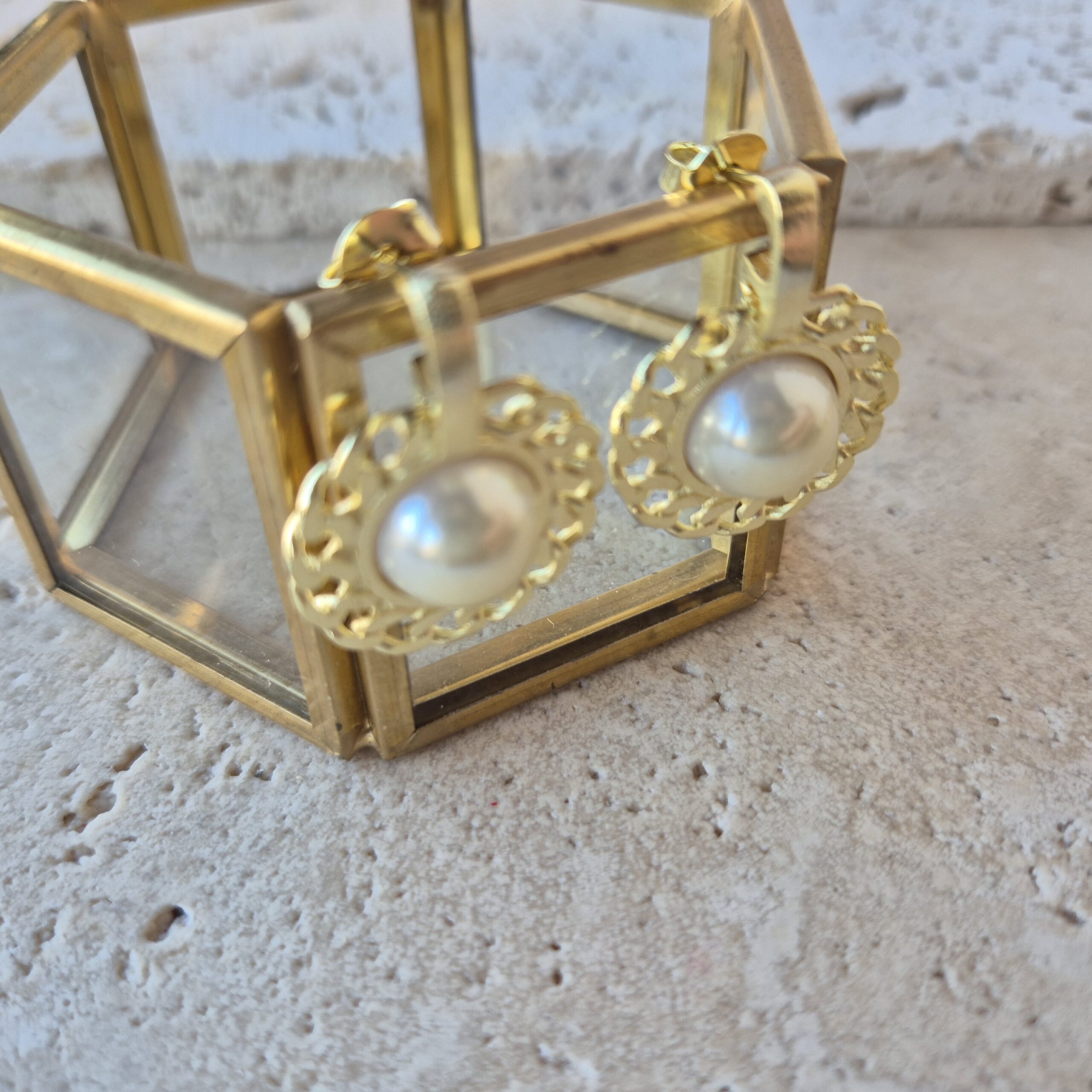 Aros diseño vintage, con perlas de río inscrustada, el material es bronce con enchape de oro 18k, 7 micras de oro premiun brasileño, libres de níquel, hipoalergenico. Miden 25 mm