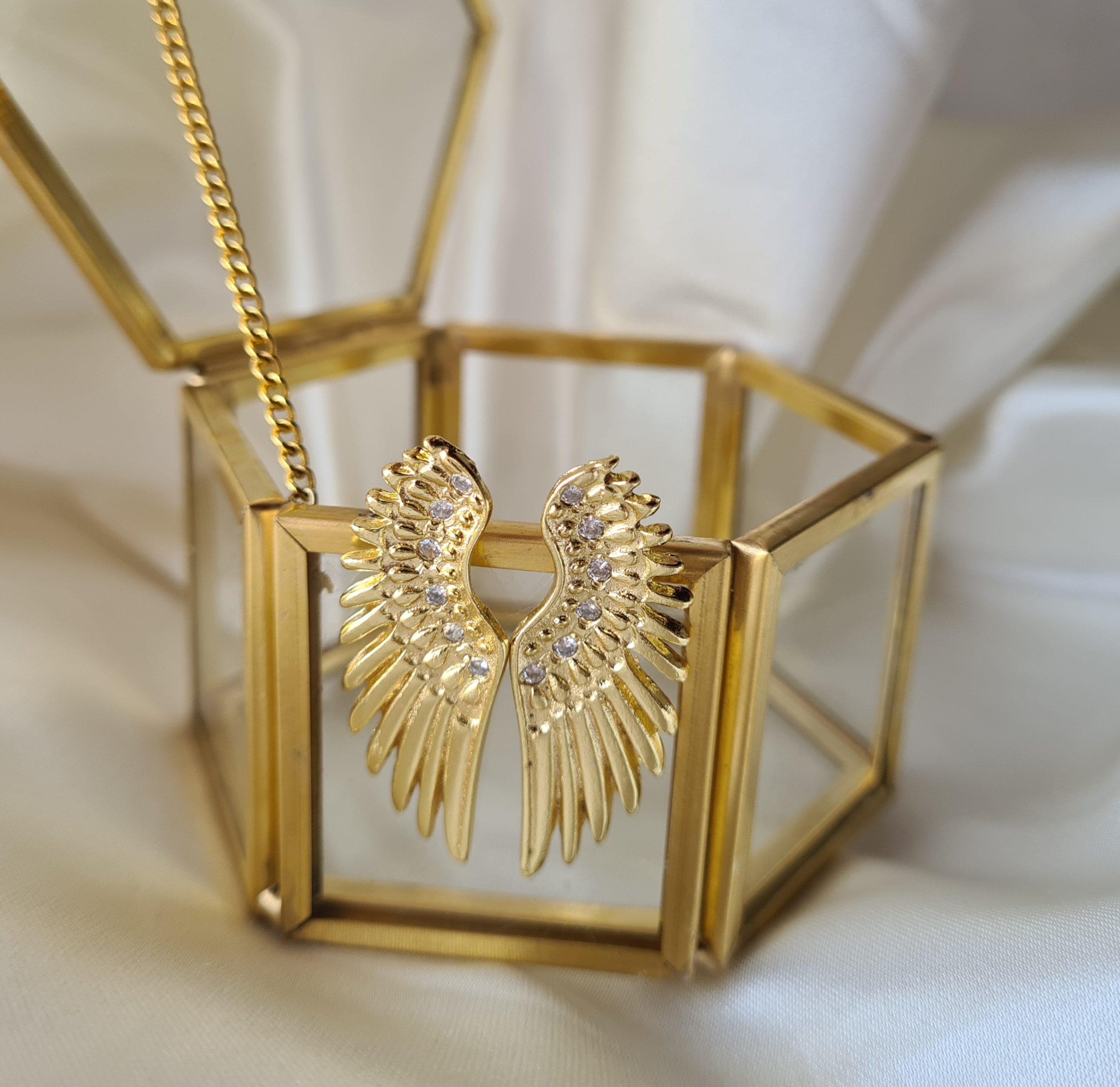 Aros alas con inscrustaciones de circones, miden 4 cms aproximadamente, el material es bronce con enchape de oro 18k, libres de níquel