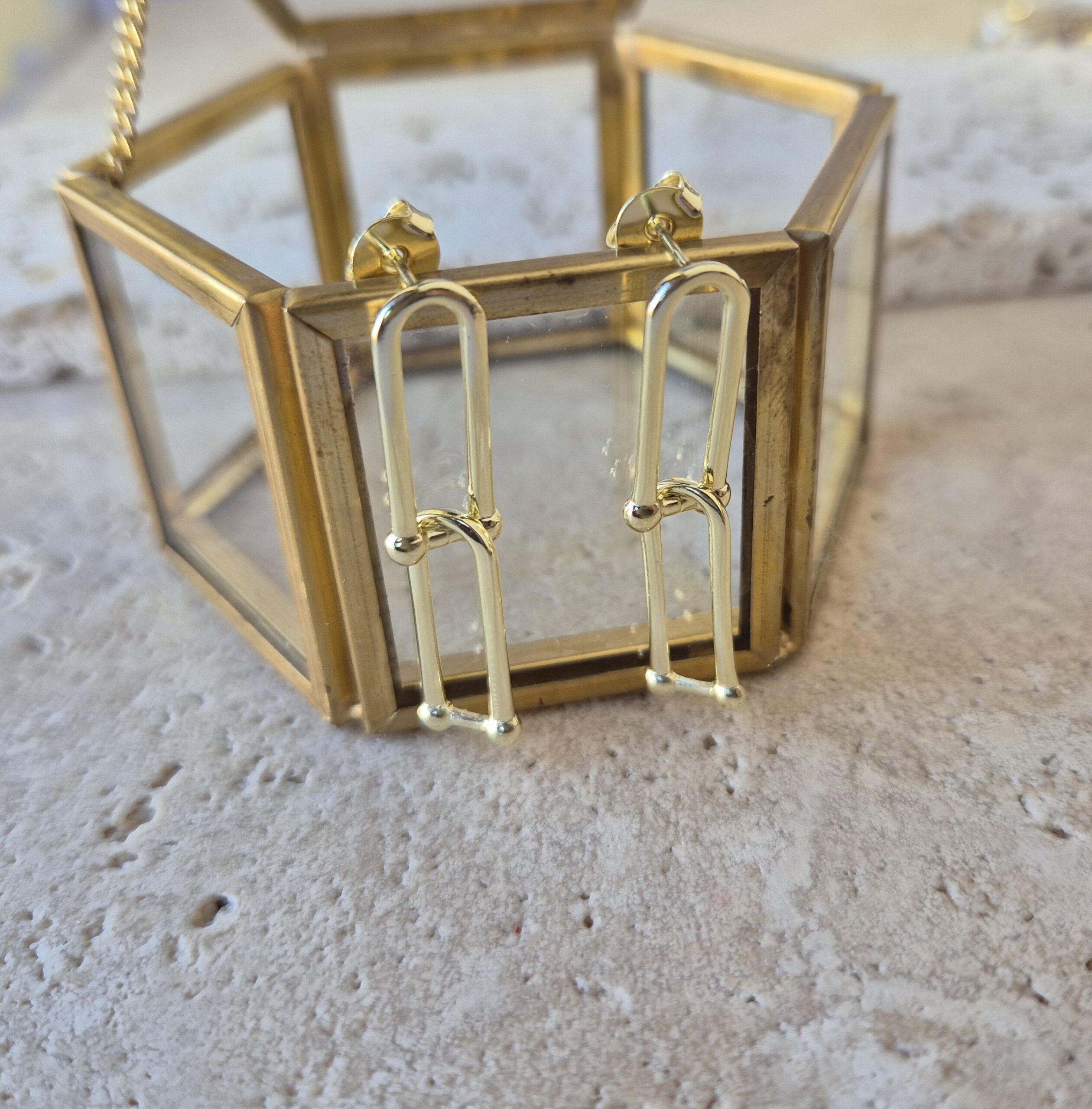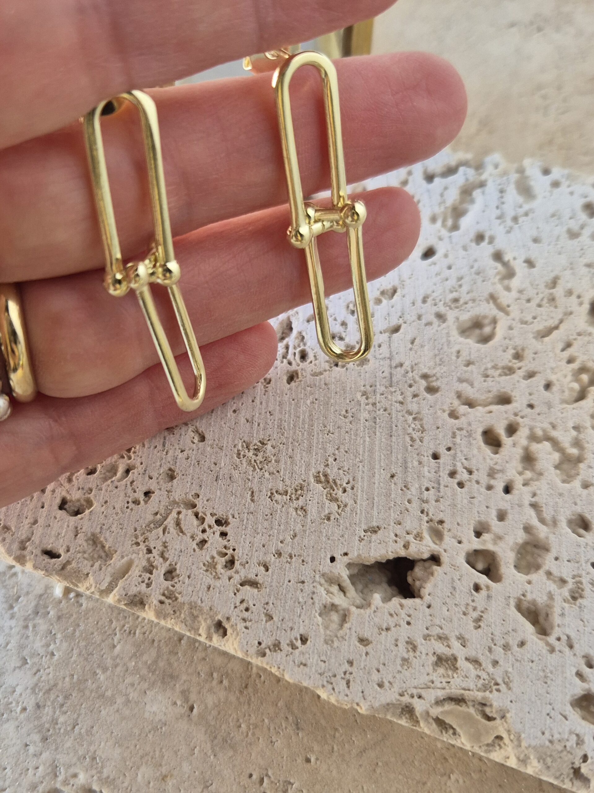 Aros doble eslabón, el material es enchape de oro 18k libre de níque, hipoalergénicos. Miden alrededor de 3,5 cms. Estos aros son perfectos para el día, además atemporales.