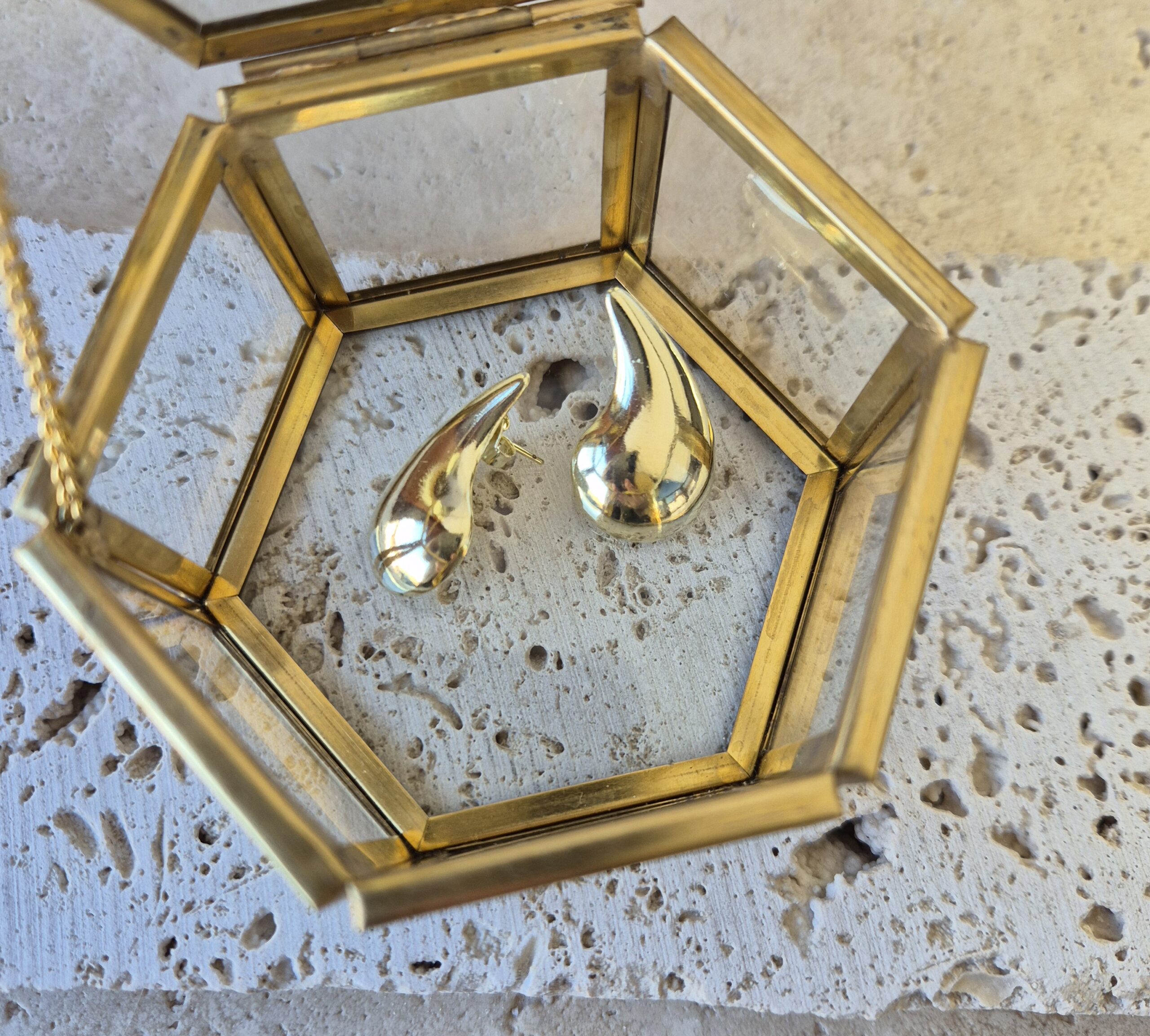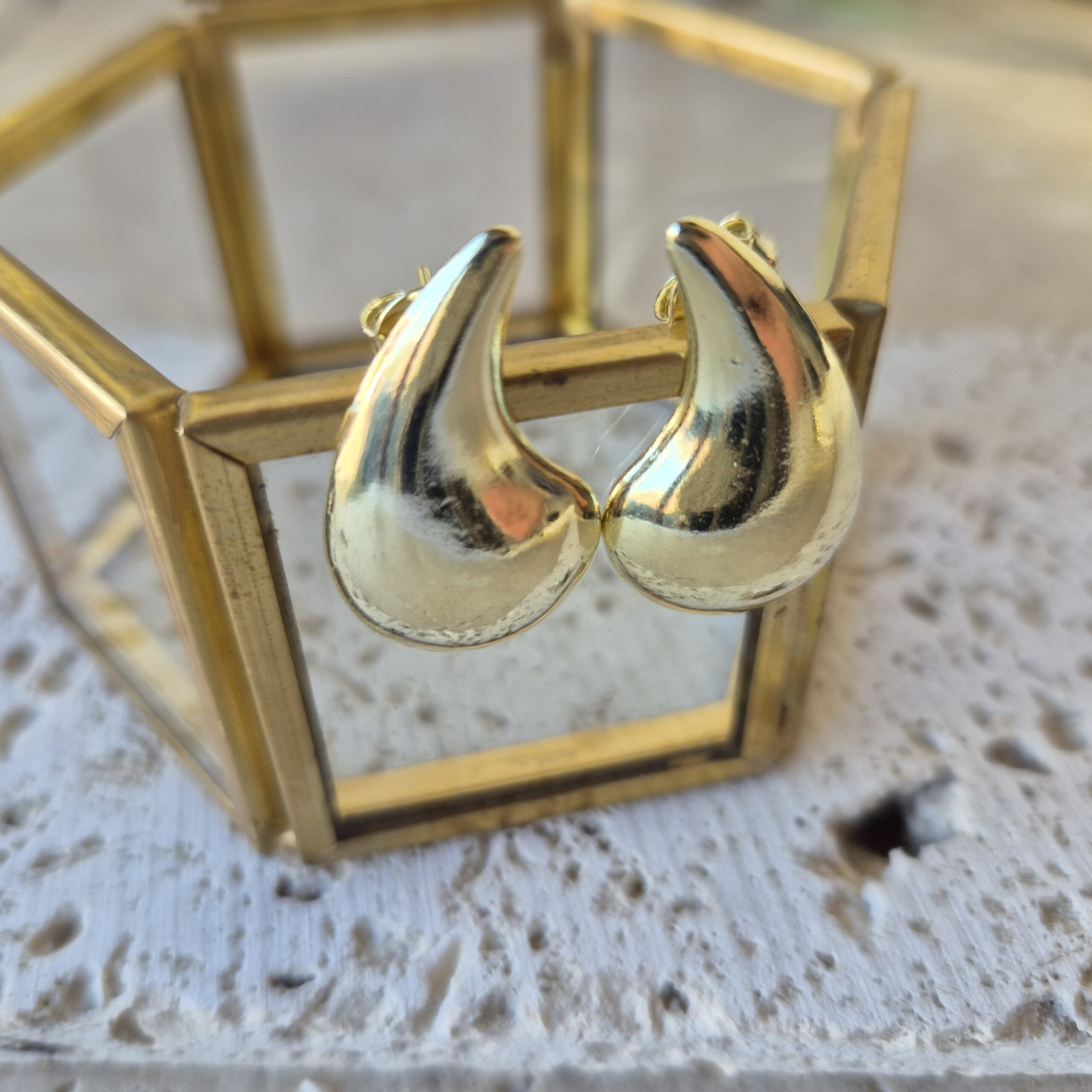 Aros gotas, macizas, efecto espejo, el material es enchape de oro 18k brasileño, libres de níquel e hipoalergénicos. Miden alrededor de 27 mm. Son el complemento perfecto apara toda ocasión.