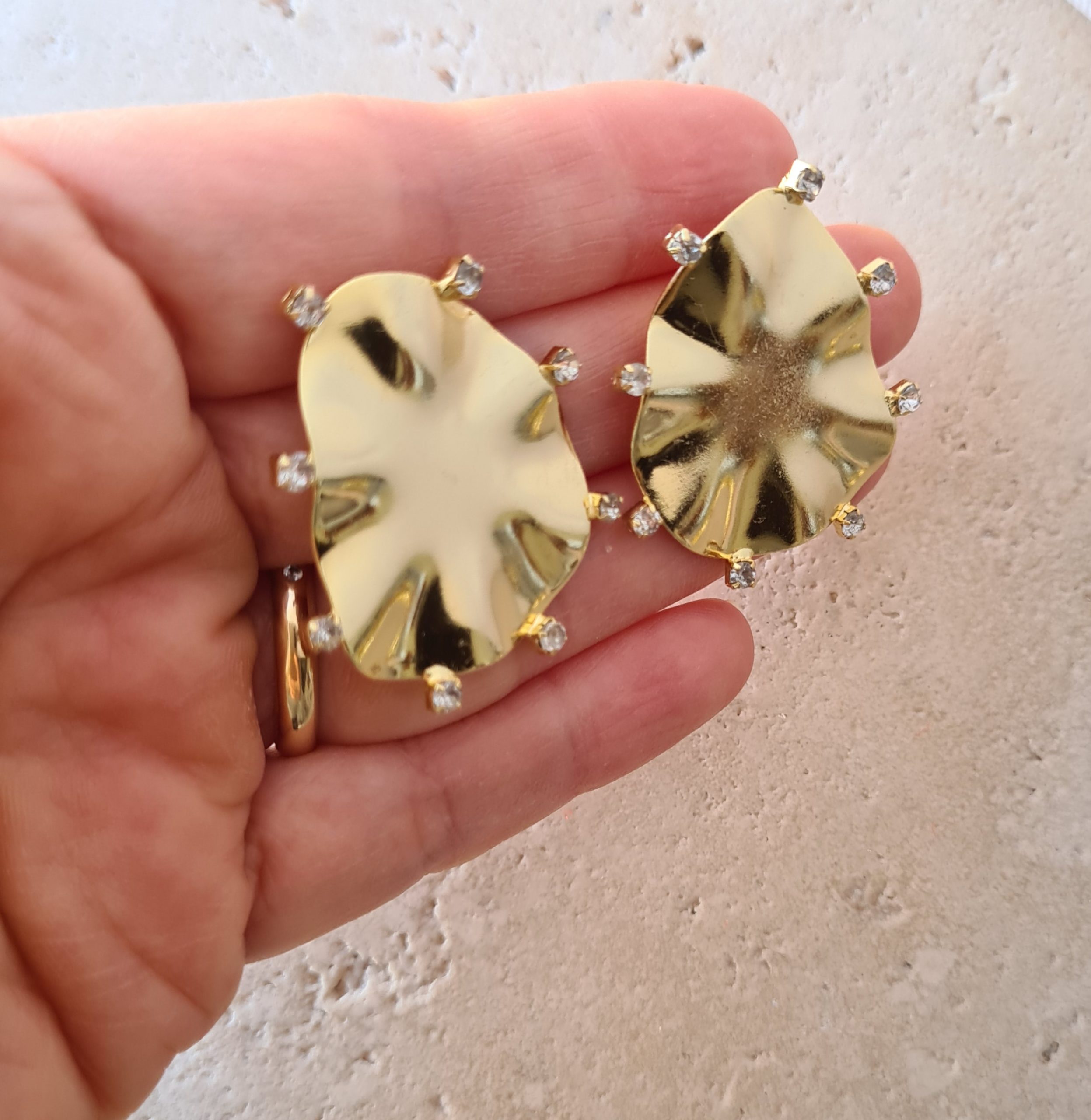 Aros placa irregular con incrustaciones de circones, tamaño 3×2.5 cms, bronce con enchape de oro 18k