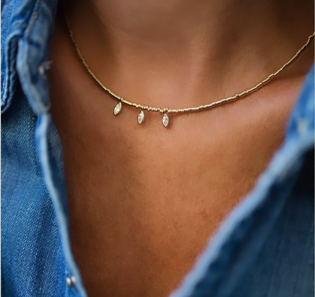 Chocker de mostacillas, con tres colgantes de mini circones, hilado 100% a mano. mide 38 cms, con alargue de 3 cms, el material es bronce con enchape de oro libre de níquel.