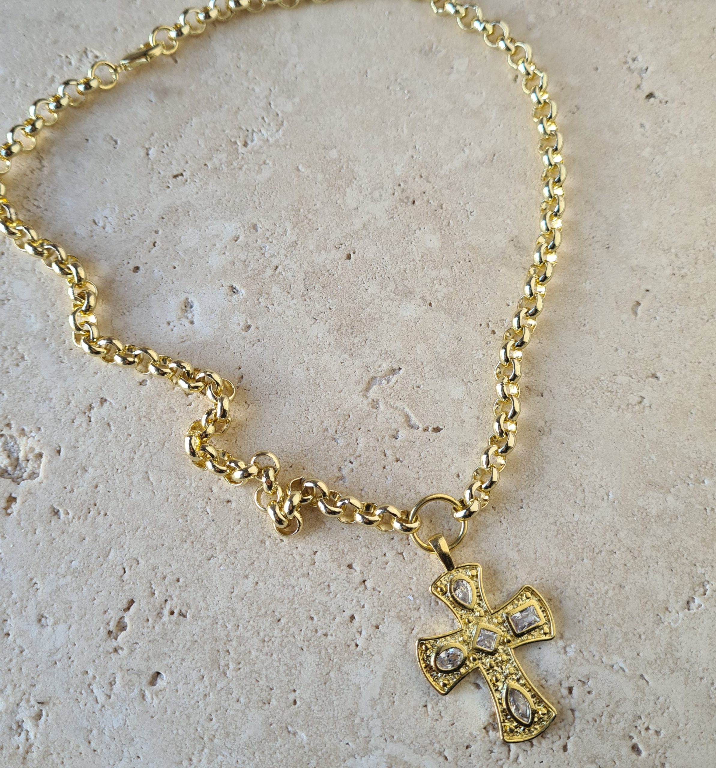 Collar 45 cms con ruz 5 cms con circones, bronce con enchape de oro 18